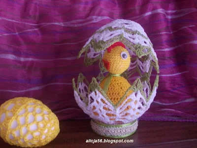 Główkę kurczaka zaczynam od zrobienia 6 półsłupków na magicznym kółeczku i dodaję w kolejnych rzędach półsłupki, najpierw co drugi i w kolejnych rzędach co trzeci, czwarty ... aż do 7. Potem już robię na kulce styropianowej dostosowując do potrzeb. Jakieś 3 rzędy bez dodawania półsłupków a potem analogicznie zmniejszając aż do 10 półsłupków zostawionych na szyjkę. Przerabiam 3 razy i znów zaczynam dodawać półsłupki na brzuszek. Teraz obrabiam większe jajko na brzuszek.